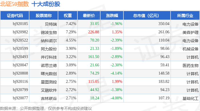 北证50(899050)指数十大成份股详情如下: