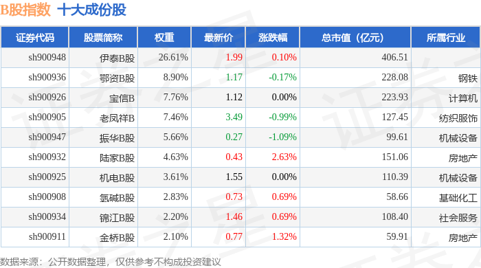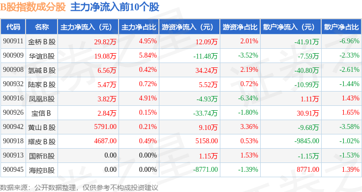 资金流向方面,B股指数(000003)成份股当日主力资金净流出合计23.61万元,游资资金净流出合计105.25万元,散户资金净流入合计128.86万元。成份股资金流向详情见下表: