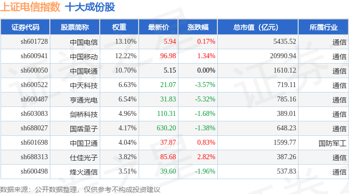 上证电信(000040)指数十大成份股详情如下: