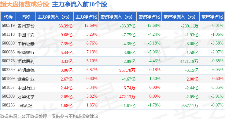 资金流向方面,超大盘(000043)指数成份股当日主力资金净流入合计53.53亿元,游资资金净流出合计54.03亿元,散户资金净流入合计5036.9万元。成份股资金流向详情见下表: