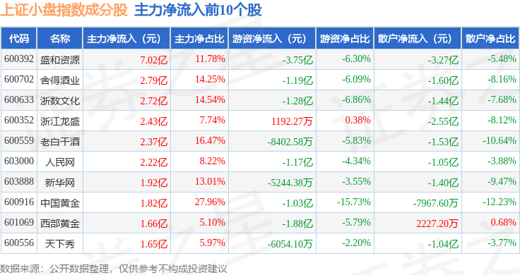 资金流向方面,上证小盘(000045)指数成份股当日主力资金净流出合计145.32亿元,游资资金净流入合计38.45亿元,散户资金净流入合计106.86亿元。成份股资金流向详情见下表: