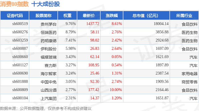 消费80(000069)指数十大成份股详情如下: