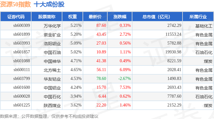 资源50(000092)指数十大成份股详情如下: