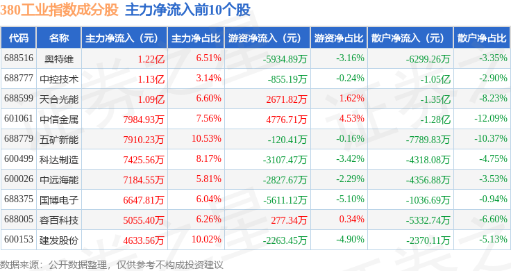 资金流向方面,380工业(000106)指数成份股当日主力资金净流出合计36.53亿元,游资资金净流入合计6.34亿元,散户资金净流入合计30.19亿元。成份股资金流向详情见下表: