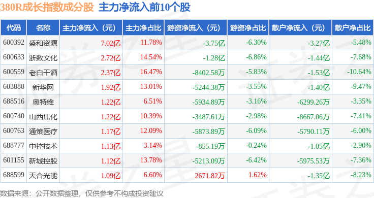 资金流向方面,380R成长(000119)指数成份股当日主力资金净流出合计116.77亿元,游资资金净流入合计37.63亿元,散户资金净流入合计79.14亿元。成份股资金流向详情见下表: