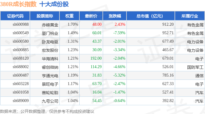 证券之星消息,1月29日,380R成长(000119)指数报收于4879.13点,跌1.59%,成交2702.95亿元,换手率2.95%。当日该指数成份股中,上涨的有98家,科达制造以10.01%的涨幅领涨,下跌的有183家,火炬电子以10.01%的跌幅领跌。