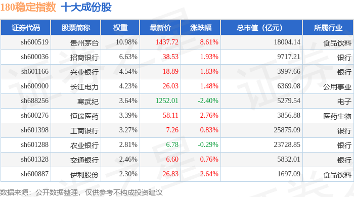 证券之星消息,1月29日,180稳定(000125)指数报收于11641.06点,涨1.77%,成交1891.59亿元,换手率0.66%。当日该指数成份股中,上涨的有67家,贵州茅台以8.61%的涨幅领涨,下跌的有21家,华润微以5.15%的跌幅领跌。