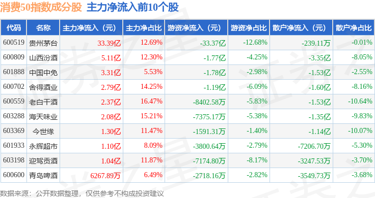 资金流向方面,消费50(000126)指数成份股当日主力资金净流入合计34.81亿元,游资资金净流出合计38.05亿元,散户资金净流入合计3.24亿元。成份股资金流向详情见下表: