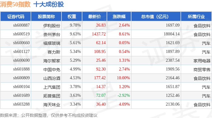 证券之星消息,1月29日,消费50(000126)指数报收于8226.86点,涨2.25%,成交851.25亿元,换手率1.85%。当日该指数成份股中,上涨的有33家,迎驾贡酒以10.01%的涨幅领涨,下跌的有17家,科博达以7.5%的跌幅领跌。