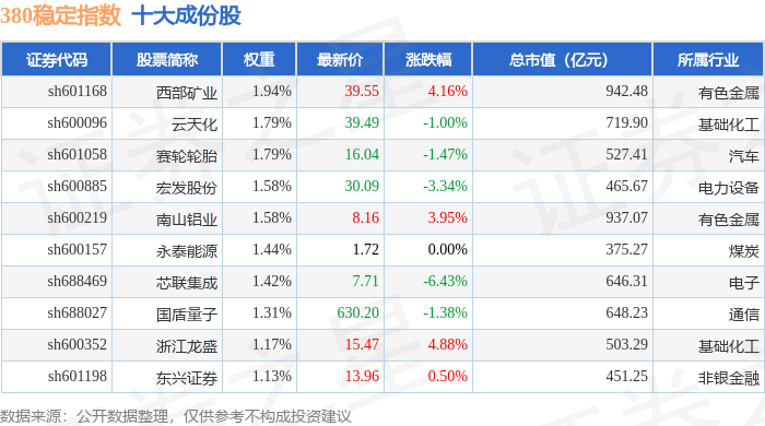 证券之星消息,1月29日,380稳定(000142)指数报收于11048.22点,涨0.3%,成交1235.99亿元,换手率2.29%。当日该指数成份股中,上涨的有104家,嘉化能源以10.05%的涨幅领涨,下跌的有79家,芯联集成以6.43%的跌幅领跌。