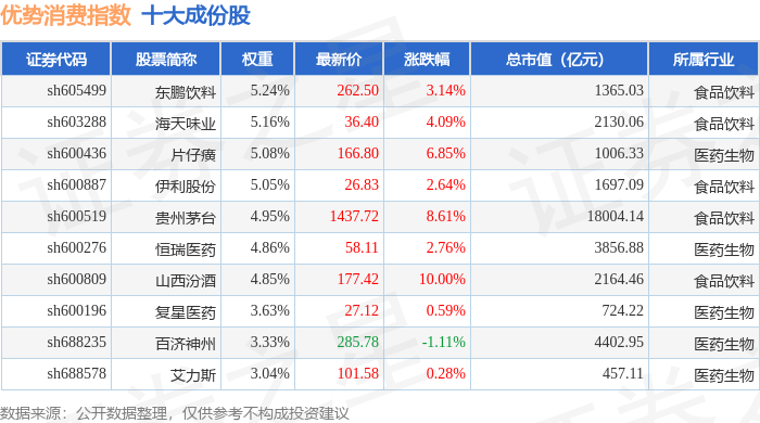 证券之星消息,1月29日,优势消费(000147)指数报收于6814.03点,涨2.87%,成交672.89亿元,换手率2.12%。当日该指数成份股中,上涨的有30家,迎驾贡酒以10.01%的涨幅领涨,下跌的有12家,君实生物以6.02%的跌幅领跌。