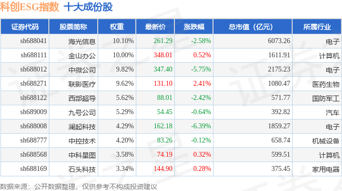 证券之星消息,1月29日,科创ESG(000691)指数报收于1630.21点,跌2.14%,成交662.01亿元,换手率2.22%。当日该指数成份股中,上涨的有10家,奕瑞科技以4.56%的涨幅领涨,下跌的有40家,安集科技以8.8%的跌幅领跌。
