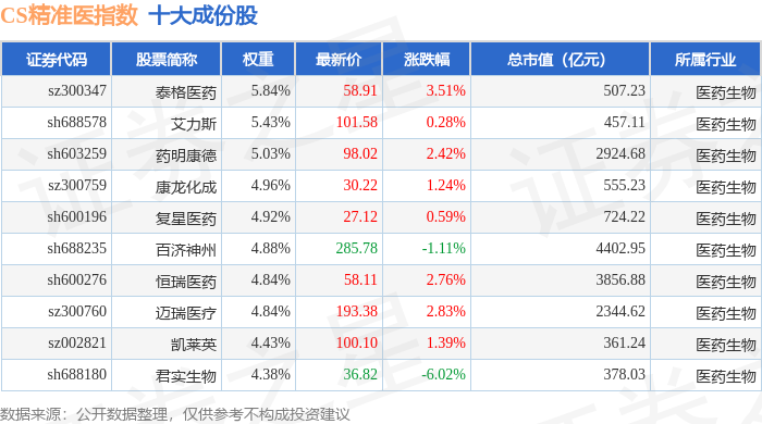 证券之星消息,1月29日,CS精准医(000863)指数报收于2846.51点,涨0.09%,成交289.14亿元,换手率2.34%。当日该指数成份股中,上涨的有17家,泰格医药以3.51%的涨幅领涨,下跌的有22家,亚虹医药以7.91%的跌幅领跌。