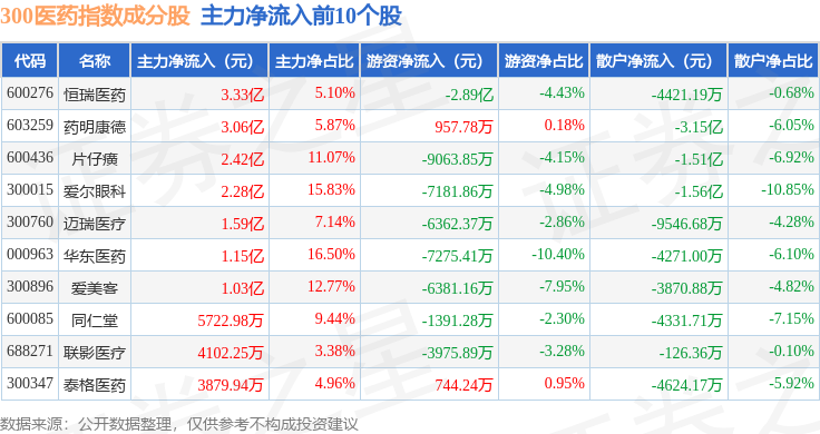 资金流向方面,300医药(000913)指数成份股当日主力资金净流入合计14.51亿元,游资资金净流出合计5.96亿元,散户资金净流出合计8.55亿元。成份股资金流向详情见下表: