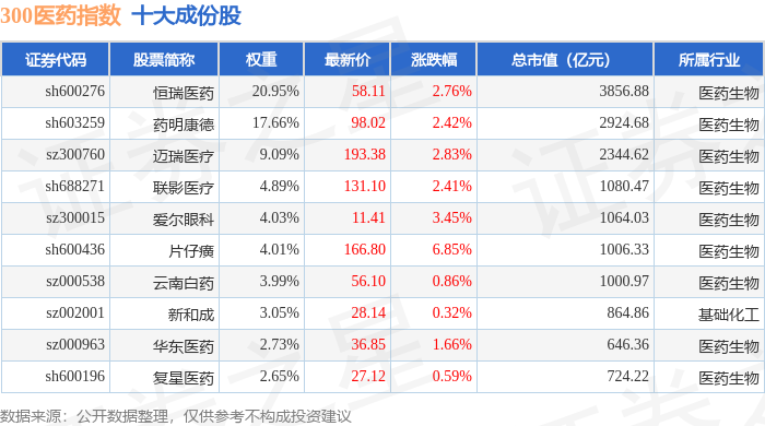 证券之星消息,1月29日,300医药(000913)指数报收于8340.77点,涨2.14%,成交290.31亿元,换手率1.31%。当日该指数成份股中,上涨的有22家,片仔癀以6.85%的涨幅领涨,下跌的有2家,百利天恒以1.69%的跌幅领跌。