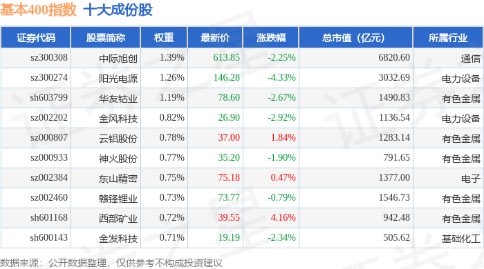基本400(000966)指数十大成份股详情如下: