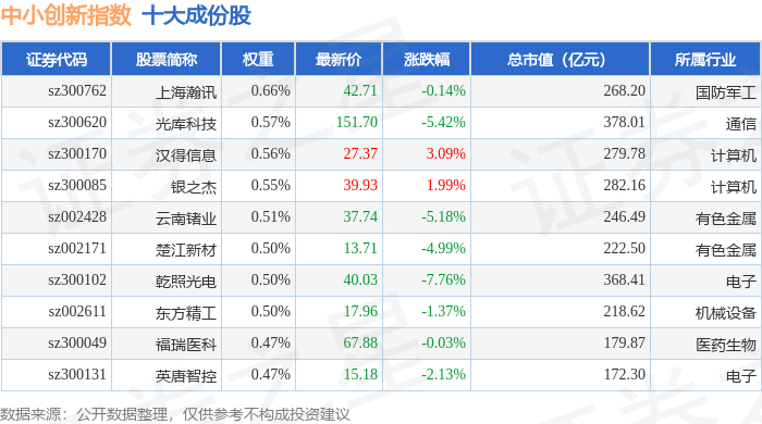 中小创新(399015)指数十大成份股详情如下: