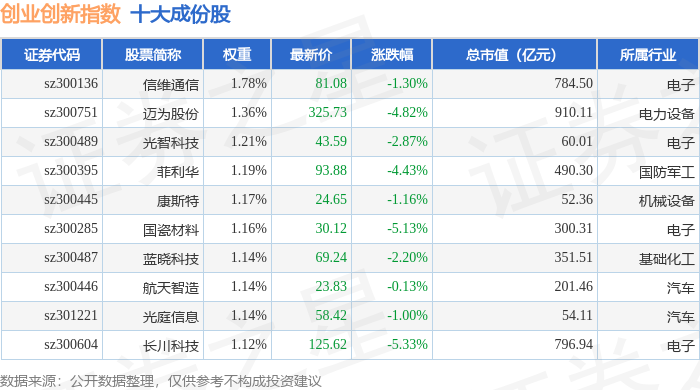 证券之星消息,1月29日,创业创新(399018)指数报收于6531.76点,跌1.72%,成交1796.48亿元,换手率4.62%。当日该指数成份股中,上涨的有23家,网宿科技以7.76%的涨幅领涨,下跌的有77家,飞荣达以8.1%的跌幅领跌。