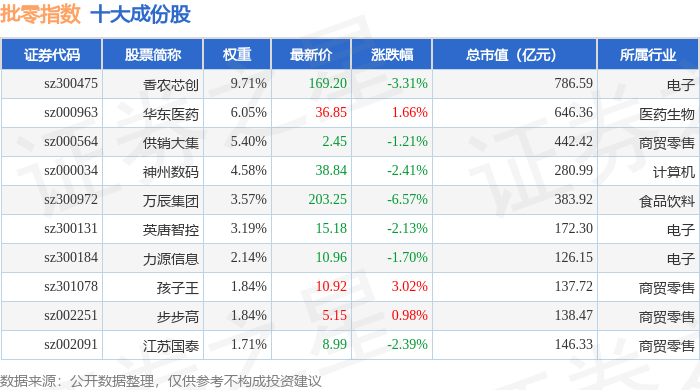 资金流向方面,批零指数(399236)成份股当日主力资金净流出合计10.27亿元,游资资金净流出合计2.18亿元,散户资金净流入合计12.45亿元。成份股资金流向详情见下表: