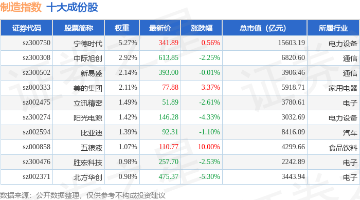 制造指数(399233)十大成份股详情如下: