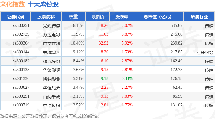 文化指数(399248)十大成份股详情如下: