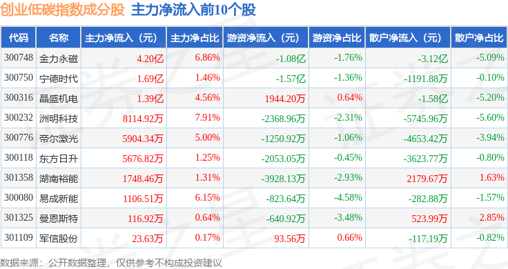 资金流向方面,创业低碳(399259)指数成份股当日主力资金净流出合计38.49亿元,游资资金净流入合计5.96亿元,散户资金净流入合计32.53亿元。成份股资金流向详情见下表:
