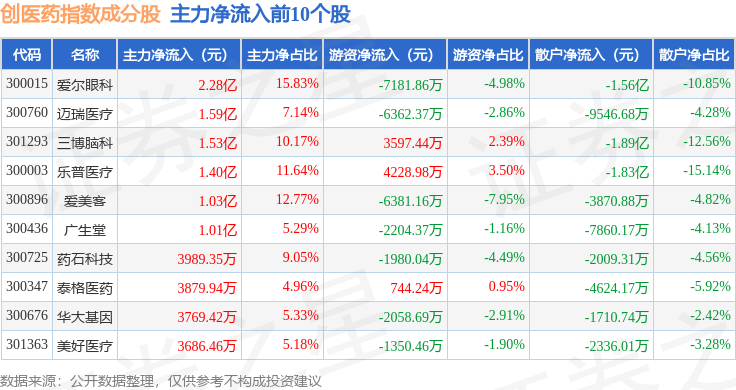 资金流向方面,创医药(399275)指数成份股当日主力资金净流入合计2.86亿元,游资资金净流出合计1.24亿元,散户资金净流出合计1.62亿元。成份股资金流向详情见下表:
