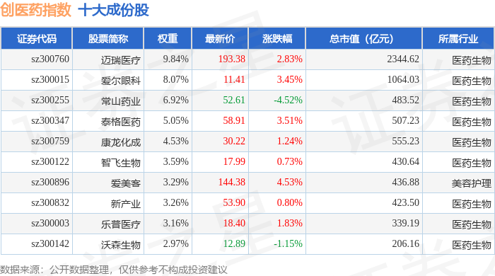 创医药(399275)指数十大成份股详情如下: