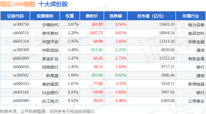 国证1000(399311)指数十大成份股详情如下: