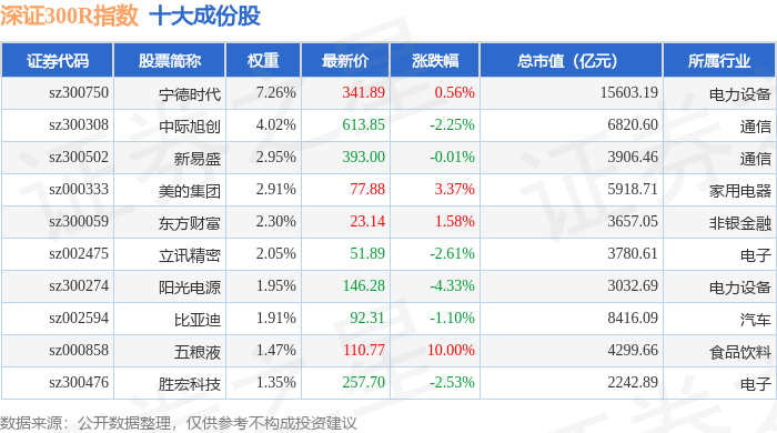 深证300R(399344)指数十大成份股详情如下: