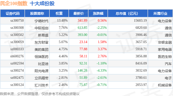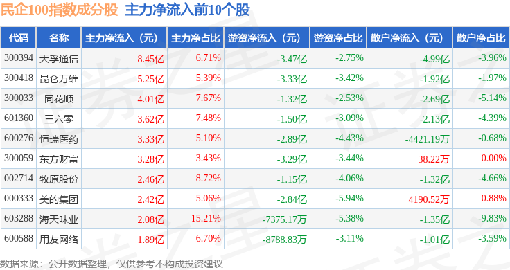 资金流向方面,民企100(399362)指数成份股当日主力资金净流出合计132.02亿元,游资资金净流入合计19.19亿元,散户资金净流入合计112.83亿元。成份股资金流向详情见下表: