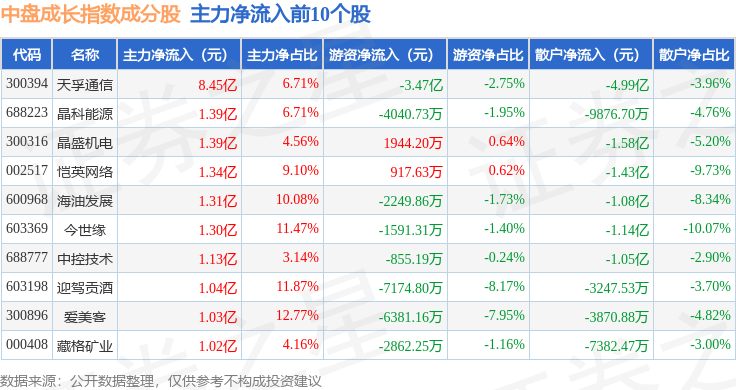 资金流向方面,中盘成长(399374)指数成份股当日主力资金净流出合计58.63亿元,游资资金净流入合计21.67亿元,散户资金净流入合计37.12亿元。成份股资金流向详情见下表:
