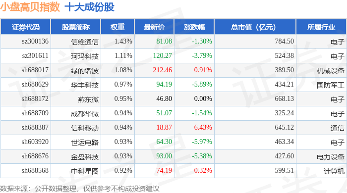 小盘高贝(399409)指数十大成份股详情如下: