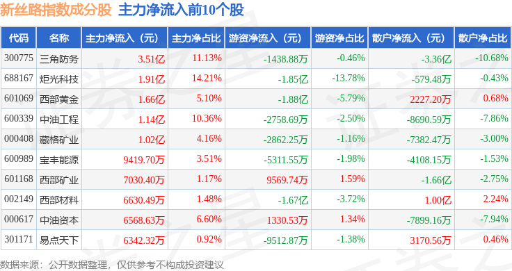 资金流向方面,新丝路(399429)指数成份股当日主力资金净流出合计37.09亿元,游资资金净流入合计6.92亿元,散户资金净流入合计29.6亿元。成份股资金流向详情见下表: