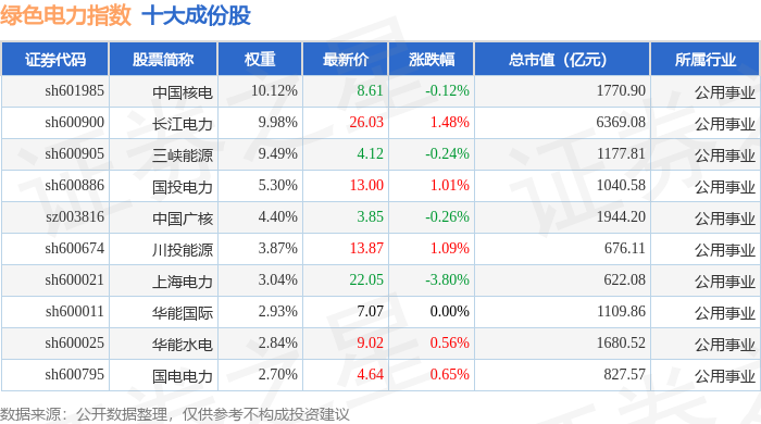 证券之星消息,1月29日,绿色电力(399438)指数报收于2063.25点,跌0.23%,成交277.5亿元,换手率1.19%。当日该指数成份股中,上涨的有13家,金开新能以4.72%的涨幅领涨,下跌的有35家,嘉泽新能以6.36%的跌幅领跌。