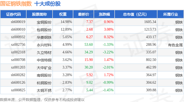 国证钢铁(399440)指数十大成份股详情如下: