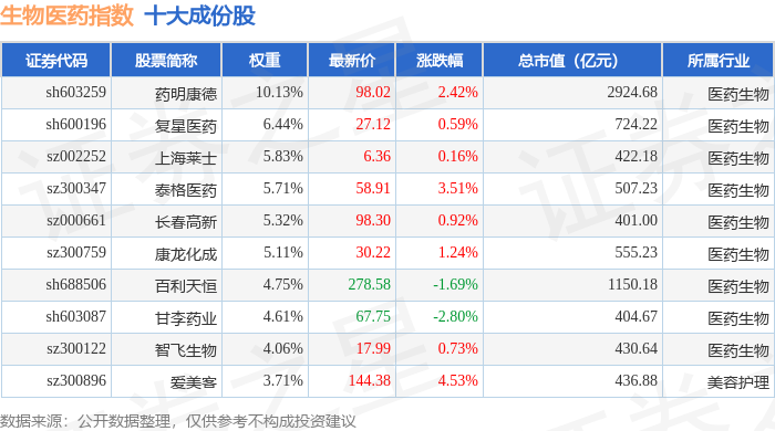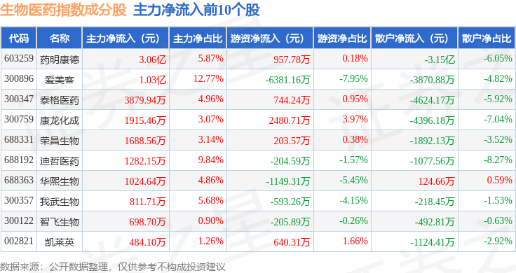 资金流向方面,生物医药(399441)指数成份股当日主力资金净流出合计1.08亿元,游资资金净流入合计1.02亿元,散户资金净流入合计514.32万元。成份股资金流向详情见下表: