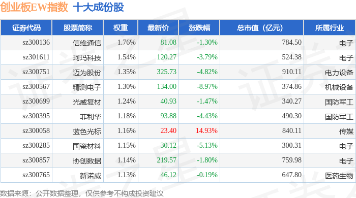 创业板EW(399635)指数十大成份股详情如下: