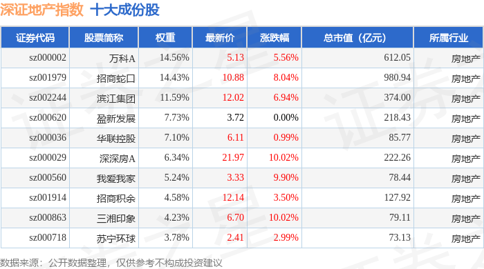深证地产(399637)指数十大成份股详情如下: