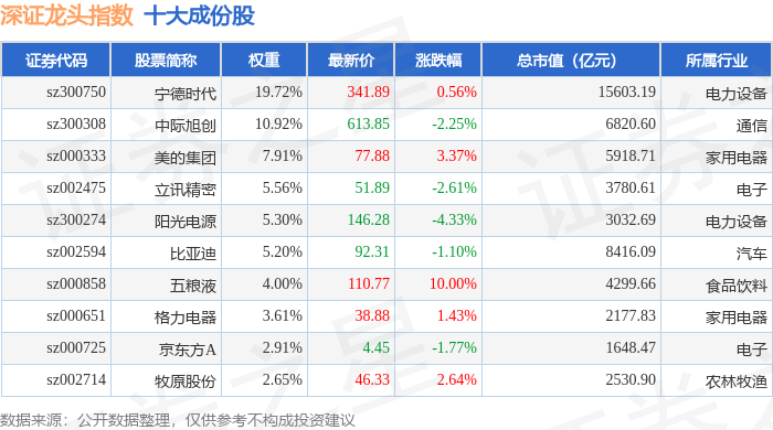 证券之星消息,1月29日,深证龙头(399653)指数报收于2959.43点,涨0.98%,成交1506.75亿元,换手率2.3%。当日该指数成份股中,上涨的有37家,华致酒行以16.05%的涨幅领涨,下跌的有12家,万辰集团以6.57%的跌幅领跌。