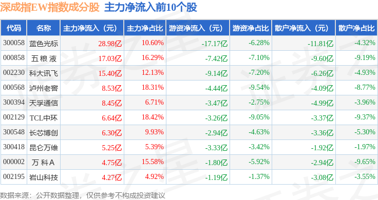 资金流向方面,深成指EW(399659)指数成份股当日主力资金净流出合计213.24亿元,游资资金净流出合计13.95亿元,散户资金净流入合计227.18亿元。成份股资金流向详情见下表: