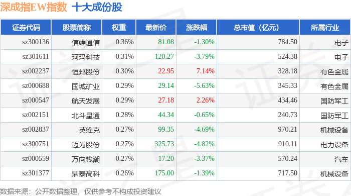 深成指EW(399659)指数十大成份股详情如下: