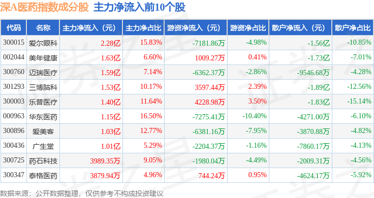 资金流向方面,深A医药(399674)指数成份股当日主力资金净流出合计6.51亿元,游资资金净流出合计7300.43万元,散户资金净流入合计7.24亿元。成份股资金流向详情见下表:
