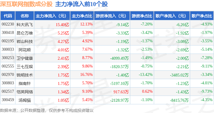 资金流向方面,深互联网(399675)指数成份股当日主力资金净流入合计25.01亿元,游资资金净流出合计23.07亿元,散户资金净流出合计1.94亿元。成份股资金流向详情见下表: