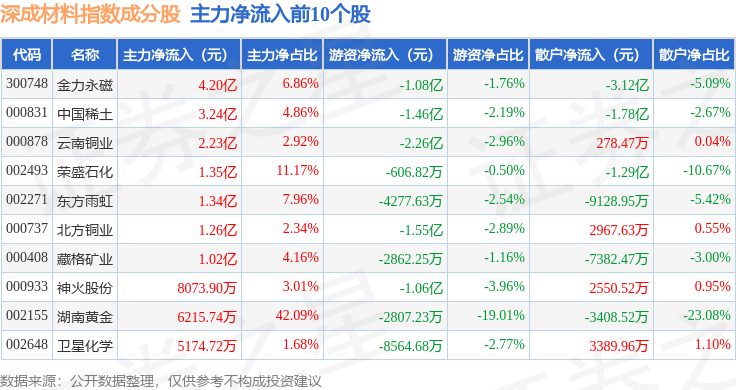 资金流向方面,深成材料(399681)指数成份股当日主力资金净流出合计51.95亿元,游资资金净流入合计8421.18万元,散户资金净流入合计51.11亿元。成份股资金流向详情见下表: