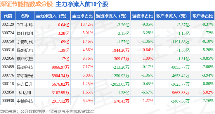资金流向方面,深证节能(399695)指数成份股当日主力资金净流出合计89.97亿元,游资资金净流入合计10.84亿元,散户资金净流入合计79.13亿元。成份股资金流向详情见下表: