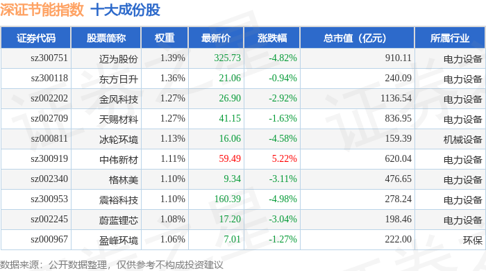 证券之星消息,1月29日,深证节能(399695)指数报收于3133.65点,跌1.27%,成交1612.23亿元,换手率3.47%。当日该指数成份股中,上涨的有25家,捷佳伟创以6.01%的涨幅领涨,下跌的有75家,沃尔核材以6.45%的跌幅领跌。