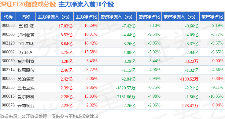 资金流向方面,深证F120(399702)指数成份股当日主力资金净流出合计41.8亿元,游资资金净流出合计22.13亿元,散户资金净流入合计63.93亿元。成份股资金流向详情见下表: