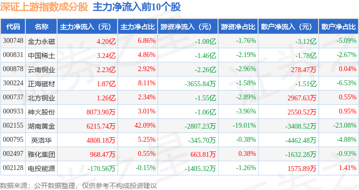 资金流向方面,深证上游(399704)指数成份股当日主力资金净流出合计64.03亿元,游资资金净流入合计6.71亿元,散户资金净流入合计57.33亿元。成份股资金流向详情见下表: