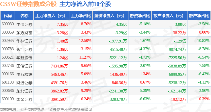 资金流向方面,CSSW证券(399707)指数成份股当日主力资金净流入合计10.9亿元,游资资金净流出合计4.25亿元,散户资金净流出合计6.65亿元。成份股资金流向详情见下表: